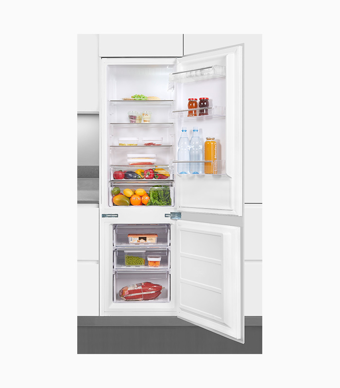 Einbau Kühl-Gefrierkombination, 4*-Gefrierfach, Innenbeleuchtung, Temperaturregelung Elektronisch, Türanschlag wechselbar, Glasablage/verstellbar: 5 / 3, Türfächer/Flaschenregal: 3 / 1, Gefrierschubladen: 3, Nettoinhalt Kühlen: 179,0 l, Nettoinhalt Gefrieren: 70,0 l, EEK: F, Weiß