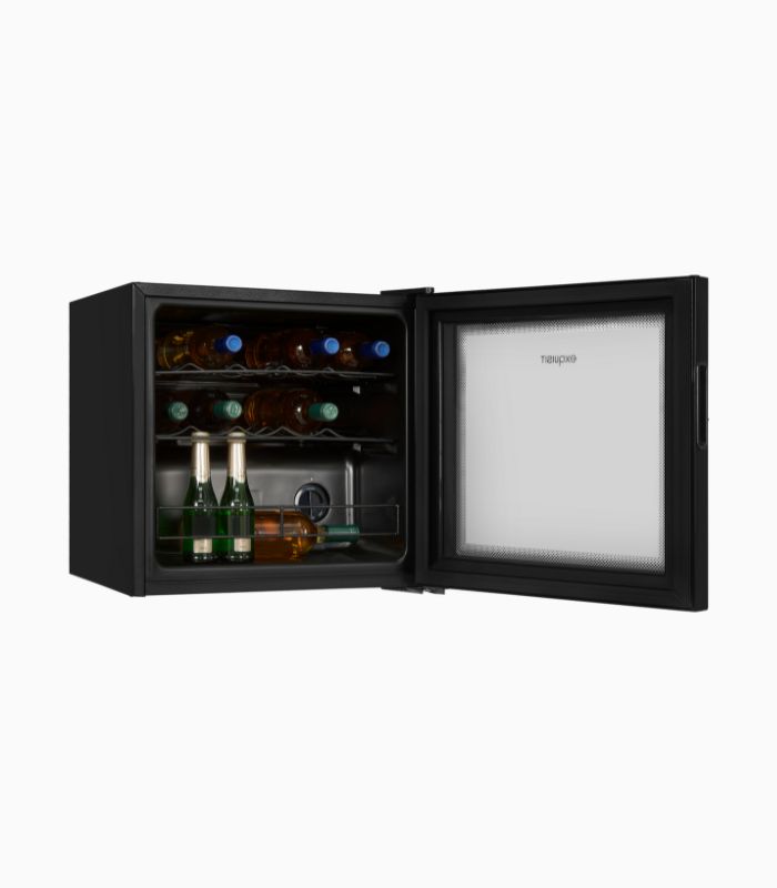Weinkühler, Standgerät, Temperaturregelung Manuell, Türanschlag wechselbar, Glasablage/verstellbar: 2 / – , Nettoinhalt Kühlen: 43,0 l, Kapazität Flaschen: 14, EEK: G, Schwarz
